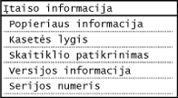 Rodoma aparato būsena, pavyzdžiui, popieriaus dydis arba dažomųjų miltelių likutis kasetėje.