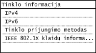 Rodomi tinklo parametrai, pvz., aparato IP adresai, ir būsena, pvz., belaidžio LAN ryšio kokybė.