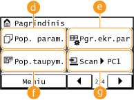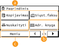 Ekranas <Pagrindinis> rodomas, kai norite pradėti operacijas arba atidaryti ekranus parametrams nustatyti. Taip pat čia galite matyti užduočių eigą ir pranešimus. Norėdami juo naudotis, palieskite ekraną.
