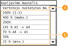 Galima padidinti arba sumažinti kopijas naudojant iš anksto nustatytą kopijavimo mastelį, pvz., <A5->A4>, arba nustatyti pasirinktinį kopijavimo mastelį 1 % žingsniais.
