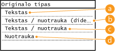 Galite pasirinkti optimalią kopijų vaizdo kokybę, atsižvelgdami į dokumento tipą, pvz., tik teksto dokumentai, dokumentai, kuriuose yra diagramų ar grafikų, arba žurnalo nuotraukos.