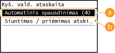 Bakstelėkite <Įjungta>, kad ataskaita būtų spausdinama automatiškai kas 40 perdavimų, arba <Išjungta>, jei nenorite, kad ataskaita būtų spausdinama automatiškai.