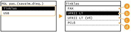 Pasirinkite puslapio aprašo kalbą, kad aparatas būtų aptinkamas kaip su ta kalba suderinamas spausdintuvas, jį prijungus prie kompiuterio naudojant funkciją „prijungti ir leisti“. Daugiau informacijos žr. „„MF Driver Installation Guide“ (MF tvarkyklės diegimo vadovas)“.