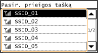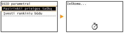 Galite ieškoti belaidžių maršrutizatorių (arba prieigos taškų), prie kurių galima prisijungti, ir pasirinkti vieną iš rodomų aparato ekrane. Kaip tinklo raktą įveskite WEP raktą arba TKIP. Prieš pasirinkdami belaidį maršrutizatorių, patikrinkite ir užsirašykite reikalingą sąrankos informaciją, įskaitant SSID ir tinklo raktą (