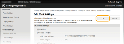 Aparato IPv6 adresus galima sukonfigūruoti naudojant priemonę „Remote UI“ (Nuotolinio vartotojo sąsaja). Prieš nustatydami IPv6 adresus, patikrinkite IPv4 adreso parametrus (IPv4 parametrų peržiūra). Kad galėtumėte naudoti IPv6 adresus, turite nustatyti tinkamus IPv4 parametrus. Atkreipkite dėmesį, kad IPv6 aplinkoje nėra nuskaitymo funkcijos, kuri naudoja skaitytuvo tvarkyklę ar „MF Scan Utility“. Įrenginyje gali būti naudojami daugiausiai devyni toliau nurodyti IPv6 adresai:
