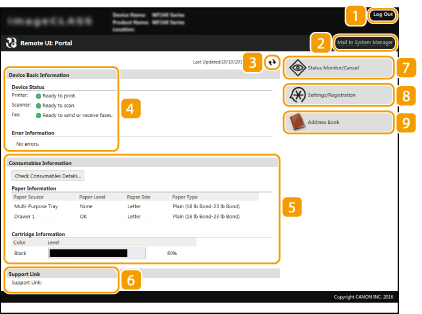Išregistruojama iš priemonės „Remote UI“ (Nuotolinio vartotojo sąsaja). Bus rodomas prisiregistravimo puslapis.