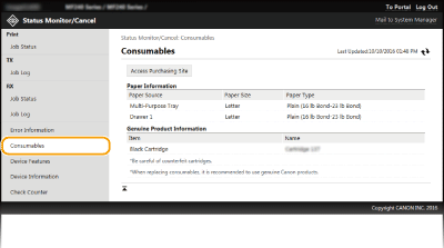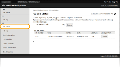 Spustelėkite [Job Number] kol fakso užduotis laukia spausdinimo, kad peržiūrėtumėte faksogramos informaciją. Galima patikrinti siuntėją, spaudinių skaičių, gautus atvaizdus ir kitą informaciją. Dokumento peržiūra naudojant nuotolinio vartotojo sąsają