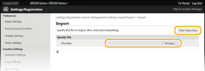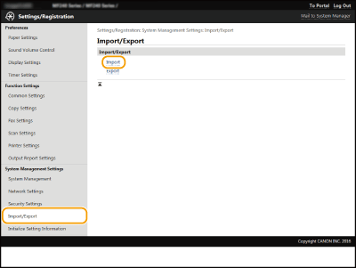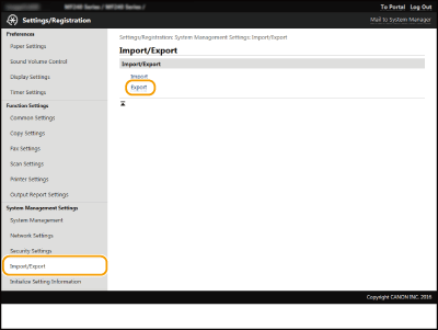 Eksportavimo / importavimo proceso metu nenaudokite aparatoPrieš eksportuodami / importuodami patikrinkite, kad šiuo metu nevykdoma jokia operacija, pvz., dokumentų spausdinimas.