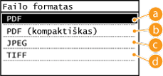 Galima pasirinkti failų formatą, kuriuos bus nuskaitomi dokumentai (pvz., PDF/JPEG/TIFF). Galima rinktis smarkiai suglaudintą PDF failą, kurio dydis yra mažesnis.