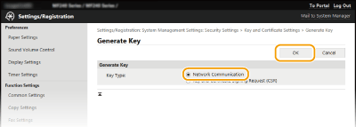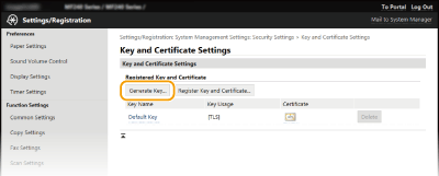 Raktų porą galima sugeneruoti naudojant aparatą, kai ji būtina užšifruotam ryšiui naudojant transportavimo lygmens saugą (TLS). Galite naudoti TLS pasiekdami aparatą naudodami priemonę „Remote UI“ (Nuotolinio vartotojo sąsaja). Aparate galima užregistruoti iki penkių raktų porų (įskaitant iš anksto įdiegtas poras). Su raktų poromis, generuotomis naudojant Network Communication, naudojami vartotojo pasirašyti sertifikatai. Naudojant Key and Certificate Signing Request (CSR) galima taikyti CA išduotus skaitmeninius sertifikatus aparato generuotai raktų porai.