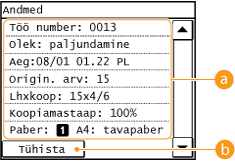 Kuvatakse koopiate arv, seaded ja muud üksikasjad. Kui soovite üksikasju lihtsalt vaadata ja paljundamist mitte tühistada, vajutage paljundamise põhikuvale naasmiseks klahvi