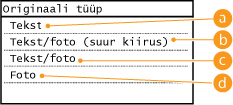 Koopia jaoks saate valida optimaalse kujutisekvaliteedi lähtuvalt dokumendi tüübist (nt tekstidokumendid, diagramme või jooniseid sisaldavad dokumendid või ajakirjafotod).