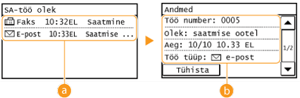 ![]() <SA-tööde logi>Kuvatakse saadetud dokumentide loend. <OK> kuvatakse siis, kui dokumendi saatmine õnnestus, ja <Tõrge> kuvatakse siis, kui dokumendi saatmine nurjus tühistamise või tõrke tõttu.