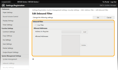 ![]() Veenduge, et poleks sisestusvigu Kui MAC-aadressid sisestatakse valesti, ei pruugi te Remote UI (Kaugkasutajaliides) kaudu seadmega juurdepääsu saada. Sel juhul peate seade <MAC-aadressi filter> olekuks määrama <Väljas>. MAC-aadressi filter