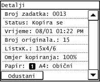 Prikazuje trenutni status odabrane stavke. Zaslon <Status zadatka kopiranja> prikazan ispod kao primjer.