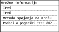 Prikazuje mrežne postavke, npr. IP adresu uređaja, i status, npr. stanje komunikacije putem bežičnog LAN-a.