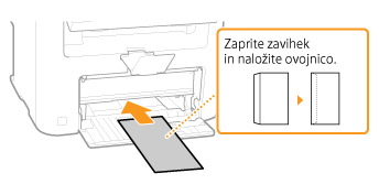 V tem poglavju je opisano nalaganje ovojnic v želeni smeri, opisani pa so tudi postopki, ki jih morate opraviti, preden naložite ovojnice. Za opis splošnega postopka nalaganja ovojnic v predal za papir ali režo za ročno podajanje glejte Nalaganje papirja v kaseto ali Nalaganje papirja v režo za ročno podajanje.