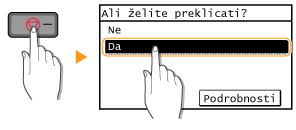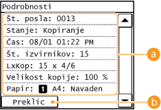 Prikažejo se število kopij, nastavitve in druge podrobnosti. Če želite samo preveriti podrobnosti, ne da bi preklicali kopiranje, pritisnite