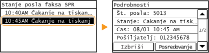 Preverite lahko podrobnosti o dokumentih, shranjenih v pomnilniku, vključno s številkami faksa in številom poslanih strani, nato pa nepotrebne dokumente izbrišete.