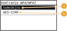 ![]() <Samodejno>Nastavi napravo tako, da ta samodejno izbere AES-CCMP ali TKIP tako, da bo ustrezalo nastavitvi brezžičnega usmerjevalnika.