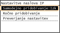 ![]() ![]() Če za dodeljevanje naslova IP ne želite uporabiti DHCP/BOOTP/RARP Izberite <Izključeno>. Če izberete <DHCP>, <BOOTP> ali <RARP>, ko te storitve niso na voljo, bo naprava porabila veliko časa in komunikacijskih virov za iskanje teh storitev v omrežju. |