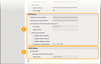 To polje potrdite, da se zapisi DNS dinamično posodobijo vsakič, ko se spremeni naslov IP naprave. Za navedbo vrste naslovov, ki jih želite registrirati na strežniku DNS, izberite potrditveno polje za [Register Manual Address], [Register Stateful Address] ali [Register Stateless Address]. Če želite vnesti interval med posodobitvami, v besedilno polje [DNS Dynamic Update Interval] vnesite čas v urah. [mDNS Settings][Use mDNS]