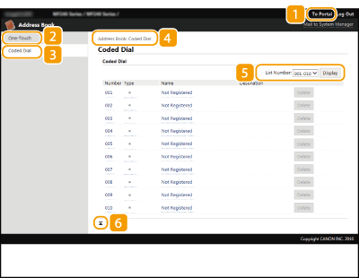 Odpre stran [Settings/Registration]. Če ste prijavljeni v načinu upravitelja sistema, lahko spremenite nastavitve in registrirane podatke shranite/naložite.