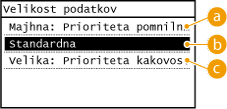 Pri pretvarjanju skeniranih dokumentov v format JPEG lahko določite razmerje stiskanja datoteke. <Majhna: Prioriteta pomnilnika> zagotavlja višje razmerje stiskanja kot je običajno in ustvari manjše datoteke z nižjo kakovostjo slike. Nasprotno pa <Velika: Prioriteta kakovosti slike> zagotavlja nižje razmerje stiskanja in ustvari večje datoteke z višjo kakovostjo slike.
