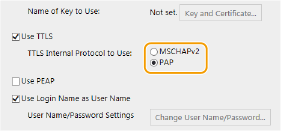 Ta način overjanja za overjanje odjemalcev uporabi uporabniško ime in geslo, za overjanje strežnikov pa potrdilo CA. Za internetni protokol lahko izberete MSCHAPv2 ali PAP. TTLS lahko uporabljate hkrati s PEAP. Preden konfigurirate ta način preverjanja pristnosti, omogočite TLS za oddaljeni uporabniški vmesnik (