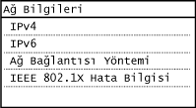 Makinenin IP adresi gibi ağ ayarlarını ve kablosuz LAN iletişimlerinin durumu gibi durumları görüntüler.