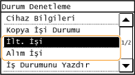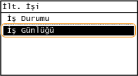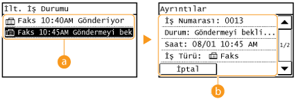 ![]() <İlt İşi Günlüğü>/<Faks Alım İş Günlüğü>Gönderilen ve alınan belgelerin listesini görüntüler. <Tamam> bir belge başarıyla gönderildiğinde veya alındığında görüntülenir ve <Hata>, iptal edildiği ya da hata oluştuğu için belge gönderilemediğinde veya alınamadığında görüntülenir.