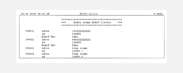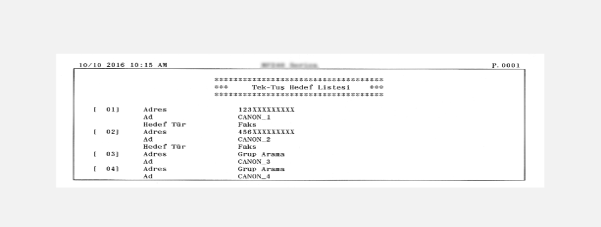 Adres Defterinde <Kodlu Arama>, <Tek-Tuş> ve <Grup Arama> olarak kayıtlı hedefler listesini bir Adres Defteri Listesi yazdırarak denetleyebilirsiniz.