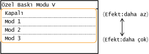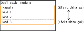 <Kapalı> veya <Mod 1> ayarı ile yazdırma kağıdına lekeler yapışabilir. <Mod 3> veya <Mod 4> ayarı ile kenar çizgileri bulanık olabilir veya görüntüler kumlu görünebilir. Yazdırma yoğunluğu ayar <Kapalı> değerinden <Mod 4> değerine ilerledikçe daha hafif hale gelir.