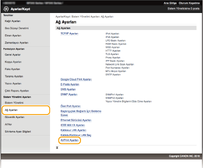 AirPrint ile kullanılabilen tarama işlevini açabilir/kapatabilirsiniz. Varsayılan fabrika ayarı <Açık> seçeneğidir.