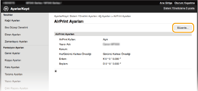 AirPrint ile yazdırma ve faks gönderme işlemi yapılıp yapılmayacağını belirtebilirsiniz. Varsayılan fabrika ayarı [Açık] seçeneğidir.