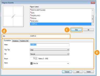 Filigranın metnini, rengini veya yazdırma konumunu belirtmek için her bir sekmeyi tıklatın. Daha fazla bilgi için, yazıcı sürücüsü ekranında [Yardım] düğmesini tıklatın.