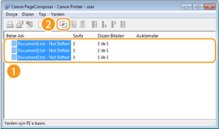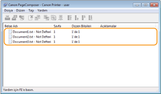 Canon PageComposer'ı kullanarak birden çok belgeyi tek bir yazdırma işinde birleştirebilir ve belirtilen yazdırma ayarları ile işi yazdırabilirsiniz. Bu işlev örneğin, farklı uygulamalarla yapılan belgeleri birleştirmenize ve aynı kağıt boyutundaki tüm sayfaları yazdırmanıza olanak sağlar.