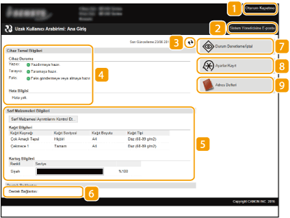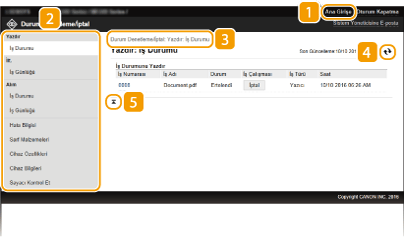 Geçerli yazdırma belgelerinin durumunu ve yazdırılan, kopyalanan, gönderilen ve alınan belgelerin geçmişini görüntüler. Makinenin durumunu da denetleyebilirsiniz.