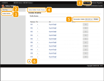 Adres Defterinde kayıtlı hedefleri görüntüler. Sistem Yöneticisi Modunda oturum açtığınızda Adres Defterini kaydedebilir veya düzenleyebilirsiniz.