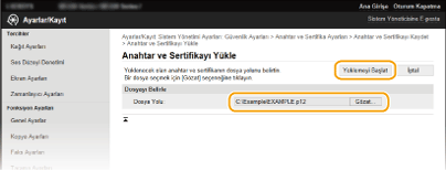Anahtar çiftleri ve dijital sertifikalar, makineyle kullanım için bir sertifika yetkilisinden (CA) alınabilir. Uzak Kullanıcı Arabirimi'ni kullanarak bu dosyaları saklayabilir ve sonra kaydedebilirsiniz. Anahtar çifti ve sertifikanın, makinenin gereksinimleri karşıladığından emin olun (