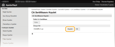 Bir anahtar çifti, [Anahtar Kullanımı] altında "[TLS]" veya "[IEEE 802.1X]" görüntülendiğinde olduğu gibi, geçerli olarak herhangi bir amaçla kullanılıyorsa silinemez. Bu durumda, anahtar çiftini silmeden önce işlevi devre dışı bırakın veya anahtar çiftini değiştirin. Önceden yüklü olan CA sertifikası silinemez.