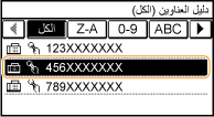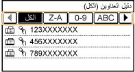 يعرض الوجهات مع أسماء المستلمين الذين تتوافق حروفهم الأولى مع حروف علامة التبويب المحددة.