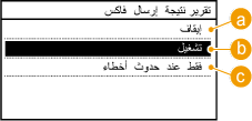 يمكنك التحقق من سجلات الفاكس أو البريد الإلكتروني للمستندات المستلمة بالإضافة إلى المستندات المحفوظة في ملف مشترك من خلال طباعة تقرير نتيجة إرسال. ويمكن طباعة التقرير في كل مرة تتم فيها عملية الإرسال أو فقط عند حدوث خطأ في الإرسال.