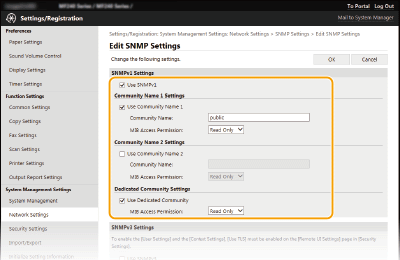 البروتوكول البسيط لإدارة الشبكة (SNMP) هو عبارة عن بروتوكول لمراقبة أجهزة الاتصالات على الشبكة والتحكم بها باستخدام قاعدة إدارة المعلومات (MIB). الجهاز يدعم SNMPv1 وSNMPv3 المزود بإجراءات أمان محسنة. ويمكنك التحقق من حالة الجهاز من خلال جهاز كمبيوتر عند طباعة مستندات أو استخدام Remote UI (واجهة المستخدم البعيدة). يمكنك تمكين إما SNMPv1 أو SNMPv3 أو كليهما في الوقت نفسه. قم بتحديد الإعدادات لكل إصدار لكي يتناسب مع بيئة الشبكة والغرض من الاستخدام.