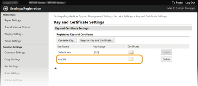 لا يمكن حذف زوج مفاتيح إذا كان مستخدمًا حاليًا لغرض ما، مثل استخدامه عند ظهور "[TLS]" أو "[IEEE 802.1X]" أسفل [Key Usage]. وفي هذه الحالة، قم بتعطيل الوظيفة أو استبدل زوج المفاتيح قبل حذفه.