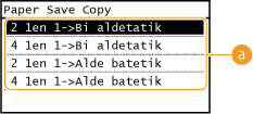 Baliteke bi aldeetatik kopiatzeko <Paper Save Copy> ezarpenak erabilgarri ez egotea hainbat paper-tamaina eta motarekin. Papera
