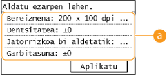 sakatzerakoan bistaratzen diren ezarpenak dira. Ezarpen lehenetsi hauek sarritan burutzen dituzun eragiketei egokitzeko aldatzen badituzu, faxak bidaltzen dituzun bakoitzean ezarpen berak konfiguratzeko beharra kendu dezakezu.