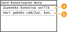 Halaber, makina ezar dezakezu konexio zuzeneko modua automatikoki itxi dezan makina konexio zuzeneneko moduan sartu ondoren denbora tarte zehatz bat igaro denean. <Hari gabeko LAN/Zuz. kon. (aldak. aut.)> zehazten bada konexio metodo gisa konexio zuzeneko moduan, makina hari gabeko LAN bati automatikoki konektatuko da konexio zuzeneko modutik irten ondoren. Kabledun edo hari gabeko LAN sarea hautatzea Zuzeneko konexioa amaitzeko ordua
