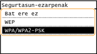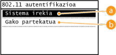 ![]() <Sistema irekia> hautatzean Hari gabeko LAN sare bati konektatzean, makinak autentifikazio-errore bat izango du autentifikazio-gako partekatua hari gabeko routerrean ezarrita badago. Hau gertatzen bada, makinak ezarpena automatikoki hona aldatuko du <Gako partekatua> eta berriz saiatuko da konektatzen. |
