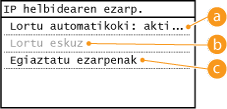 ![]() ![]() Ez baduzu DHCP/BOOTP/RARP erabili nahi IP helbide bat esleitzeko Hautatu <Desaktibatuta>. <DHCP>, <BOOTP> edo <RARP> hautatzen baduzu zerbitzu hauek erabilgarri ez daudenean, makinak denbora galduko du eta komunikazio-baliabideak alferrik galduko ditu sarean zerbitzu hauek bilatzen. |